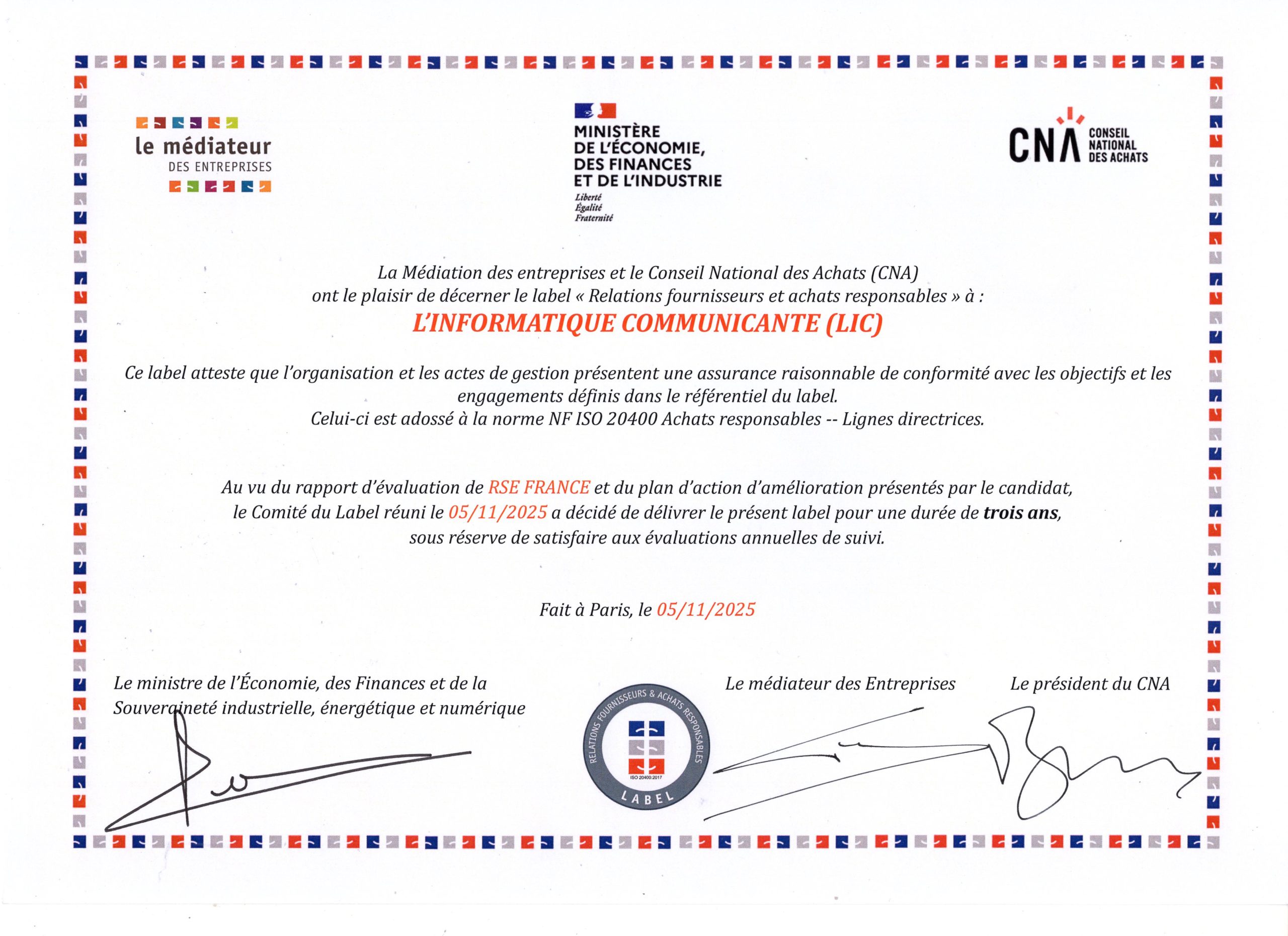 Obtenu la 1ère fois en 2015, ce label, valable 3 ans, récompense l’engagement de LIC dans une politique d’achats responsables et plus globalement sa forte volonté d’améliorer sa performance RSE et son impact sociétal et environnemental.